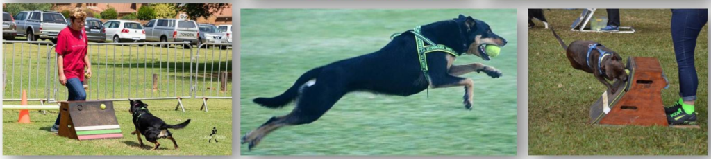 Flyball is a relay race between two teams, each consisting of four dogs. The first dog in each team is released upon a whistle and must negotiate four hurdles, trigger the flyball box that releases a tennis ball; catch the ball and return over the four hurdles through the start/finish poles. Once the first dog returns, the second dog is released, but may not cross the first dog until that dog’s nose passes the start line. The same applies for dog three and dog four. The aim is to get the dogs to pass as close as possible over the start/finish line – ideally a nose-to-nose cross.